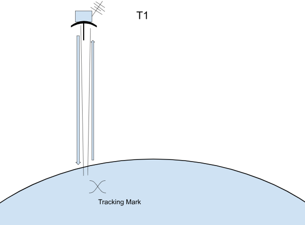 In the previous part, I did not go into crazy depth on how SAR works, so I'll include the diagram above to help you understand. The T1 and T2 represent the different times the energy burst is emitted. A satellite with an antenna emits an energy burst towards the Earth that is then reflected to a receiver that records the data. This technique is mainly used for tracking ground movements and mapping out marshlands and water bodies. The basic diagram shows how one burst travels to Earth, reflects off the surface, and returns to the receiver. The next slide shows a later time when Earth has moves a little bit. The mark that is being tracked has now moved, and the data can be used to determine the surface movement and structure. This diagram is very basic.