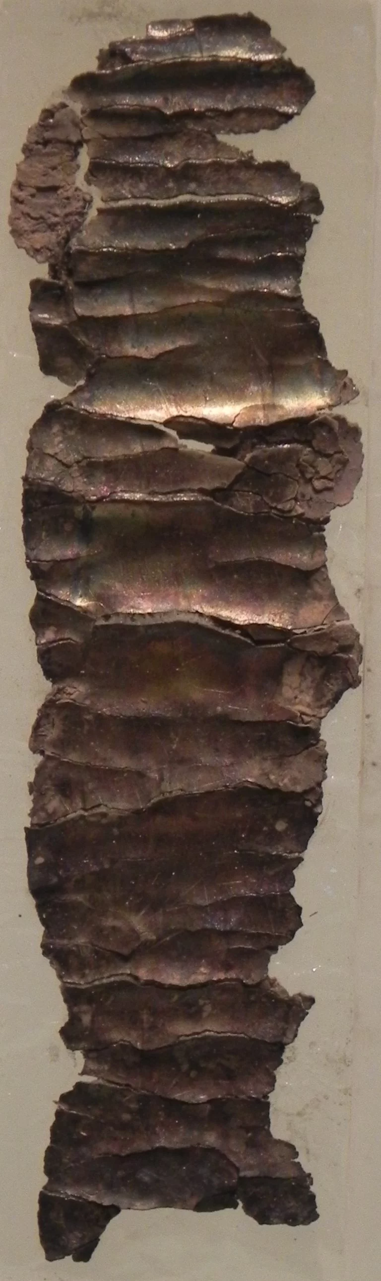 The larger scroll (KH1 and KH2 seen on the right) took three years to unroll and measured about three inches long. They were made from pure silver, and were called amulets, or objects a person would carry to ward off evil spirits and bad luck. They were often incised or embedded with a prayer or blessing, and this is the case with the Ketef Hinnom Scrolls. Both of the scrolls are now housed in the Israel Meusem in Jerusalem. The two pictures to the right are the two scrolls, the left being KH1, and the right being KH2.